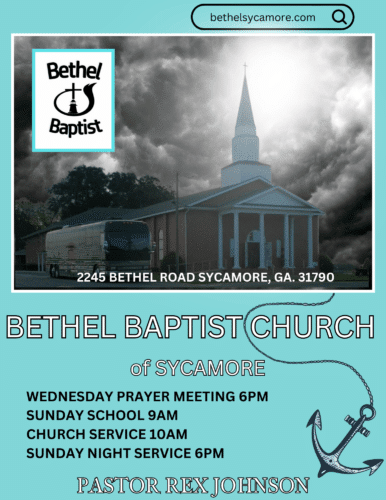 Bethel Baptist Church Listed in Religious Organization Contact 2245 Bethel Road Sycamore, GA 31790 229-567-4090 Website Contact listing ownerSend Message Name Email Phone Number Message