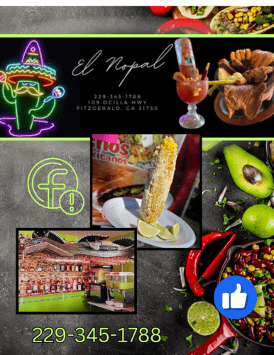 El Nopal Mexican Restaurant Listed in Food/Drinks Contact 109 Ocilla Highway Fitzgerald, GA 31750 229-345-1788 Contact listing ownerSend Message Name Email Phone Number Message